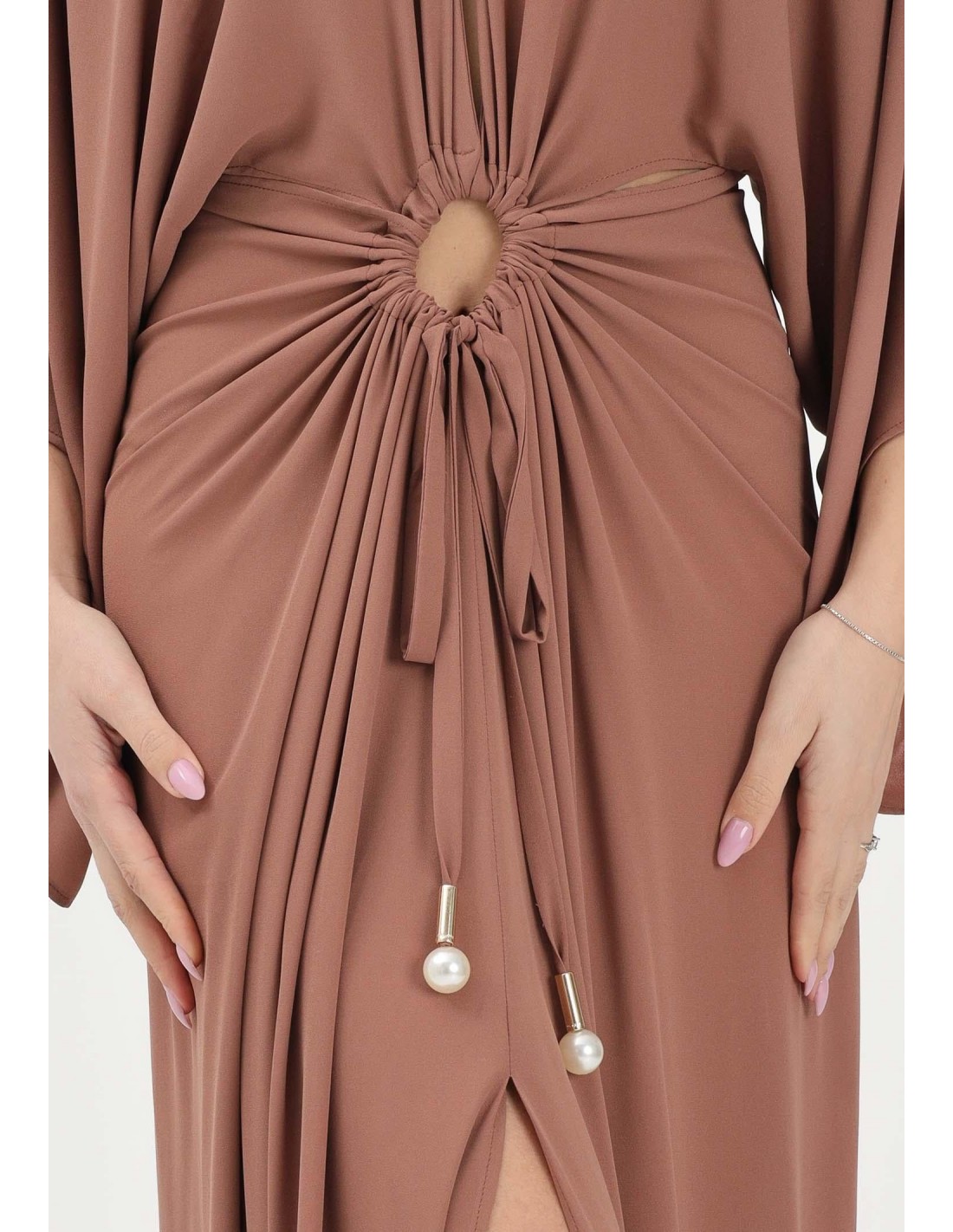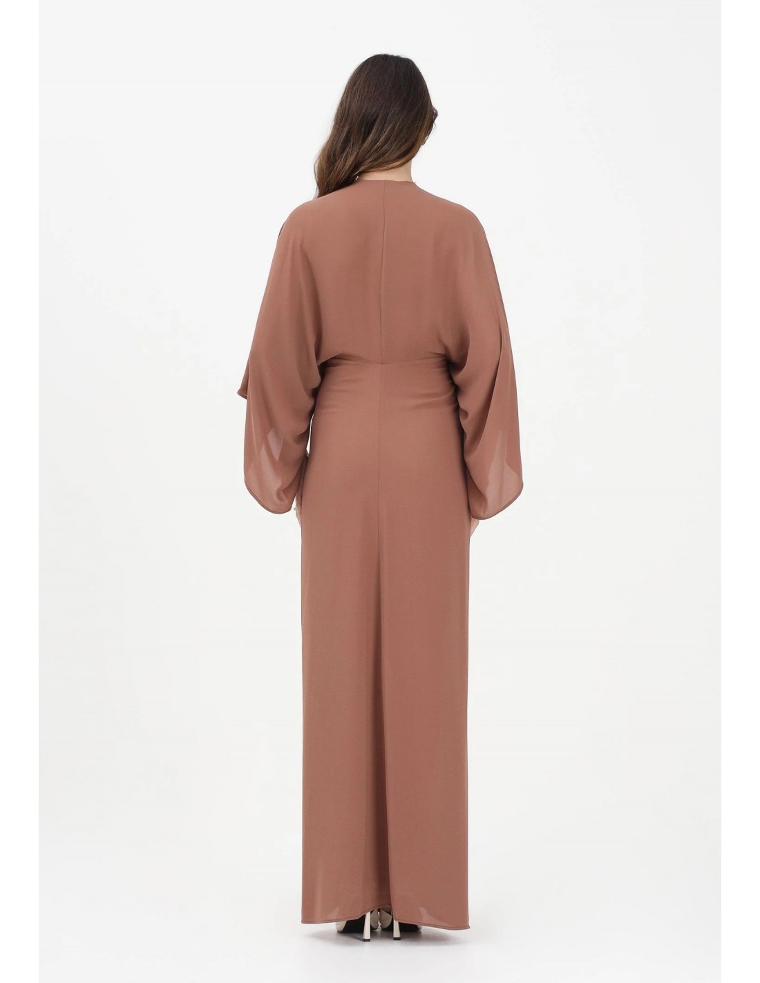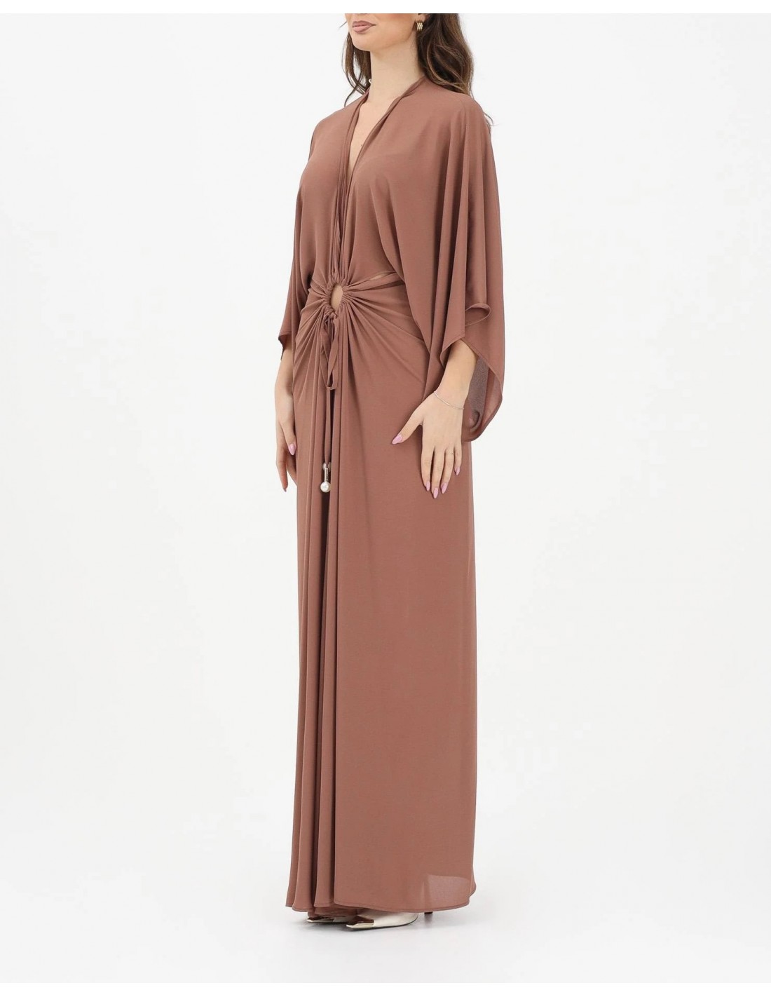 Abito lungo Alma Sanchez, caramello, composizione poliestere, maniche tre quarti, scollo a V, spacco sul fondo, nodo e chiusura con coulisse sul davanti
