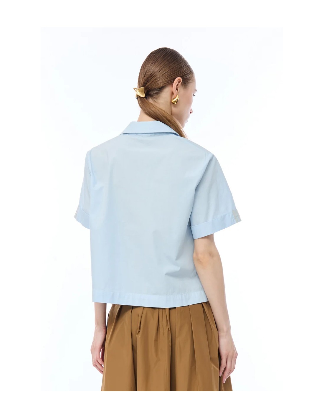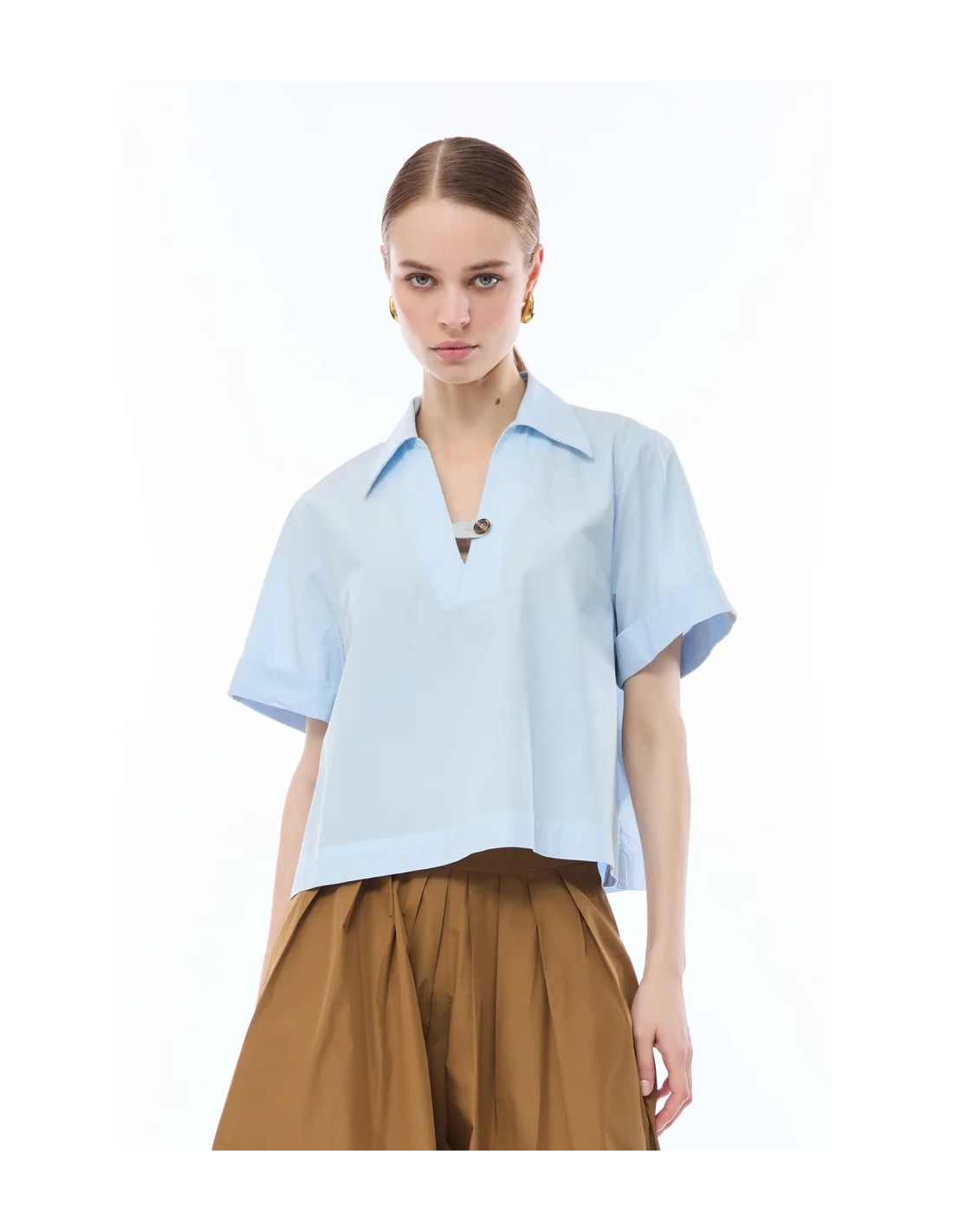 Blusa Nenette celeste valorizza ogni outfit con un tocco moderno. Realizzato in cotone, presenta maniche corte scollo a V e chiusura con zip e bottone sul davanti. Un capo versatile perfetto per outfit casual chic o più raffinati. Scoprilo subito e rinnova il tuo look.