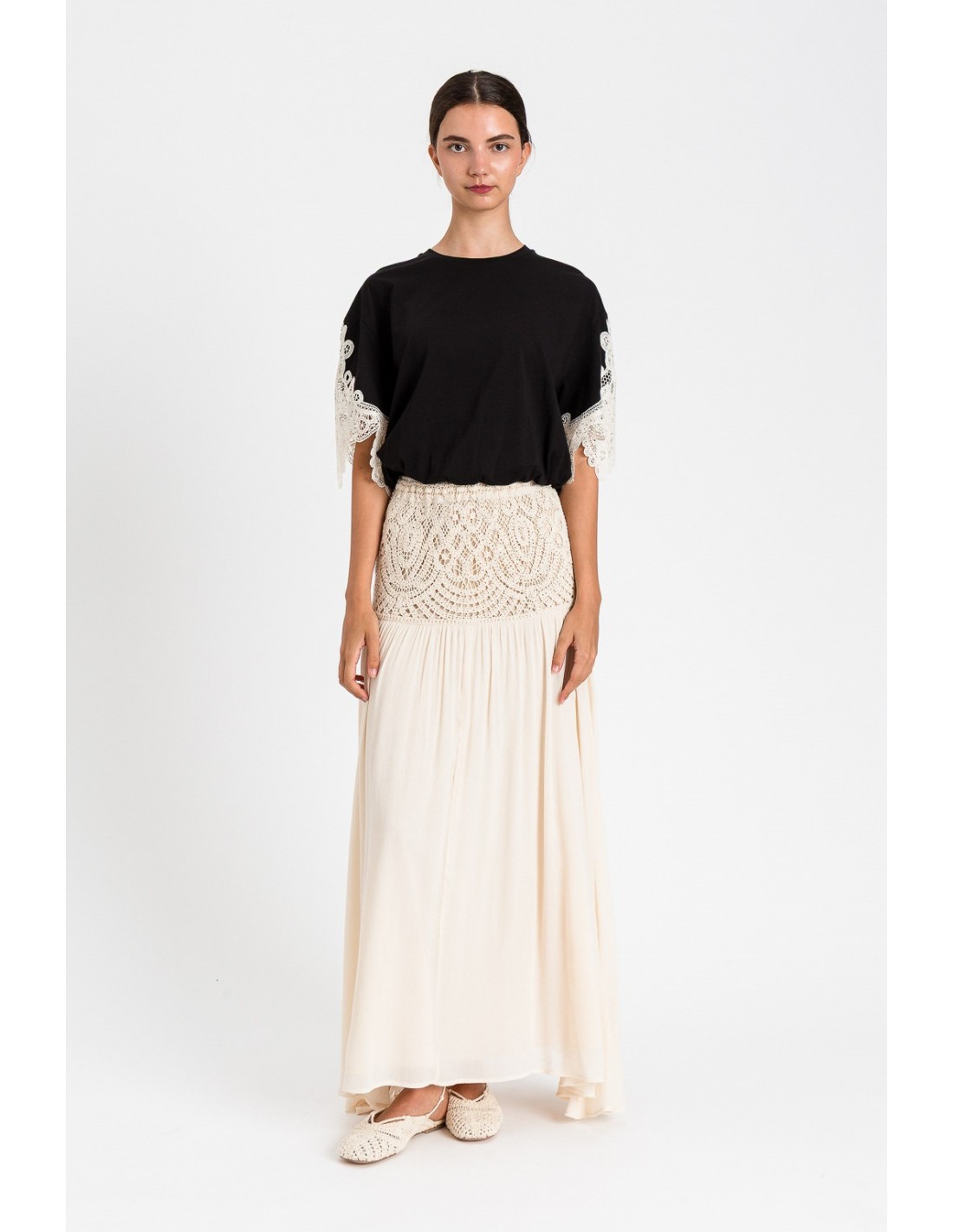 Blusa Twinset nero-avorio è la scelta ideale per chi cerca un capo di tendenza. Realizzato in jersey, presenta cotone girocollo maniche corte con macramè in applicazione ed elastico sul fondo. Pensato per offrire comfort e qualità nei dettagli. Perfetto per distinguersi con eleganza.
