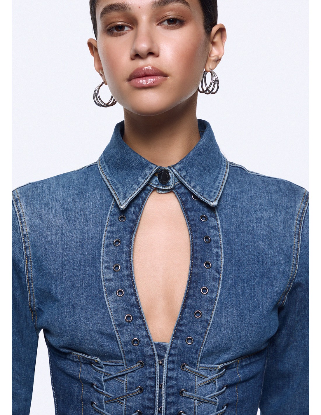 Jeans Liu-Jo, blu, composizione denim, cotone, gamba larga, stringhe in applicazione, tasche sul davanti, sul retro e chiusura con zip e bottone
