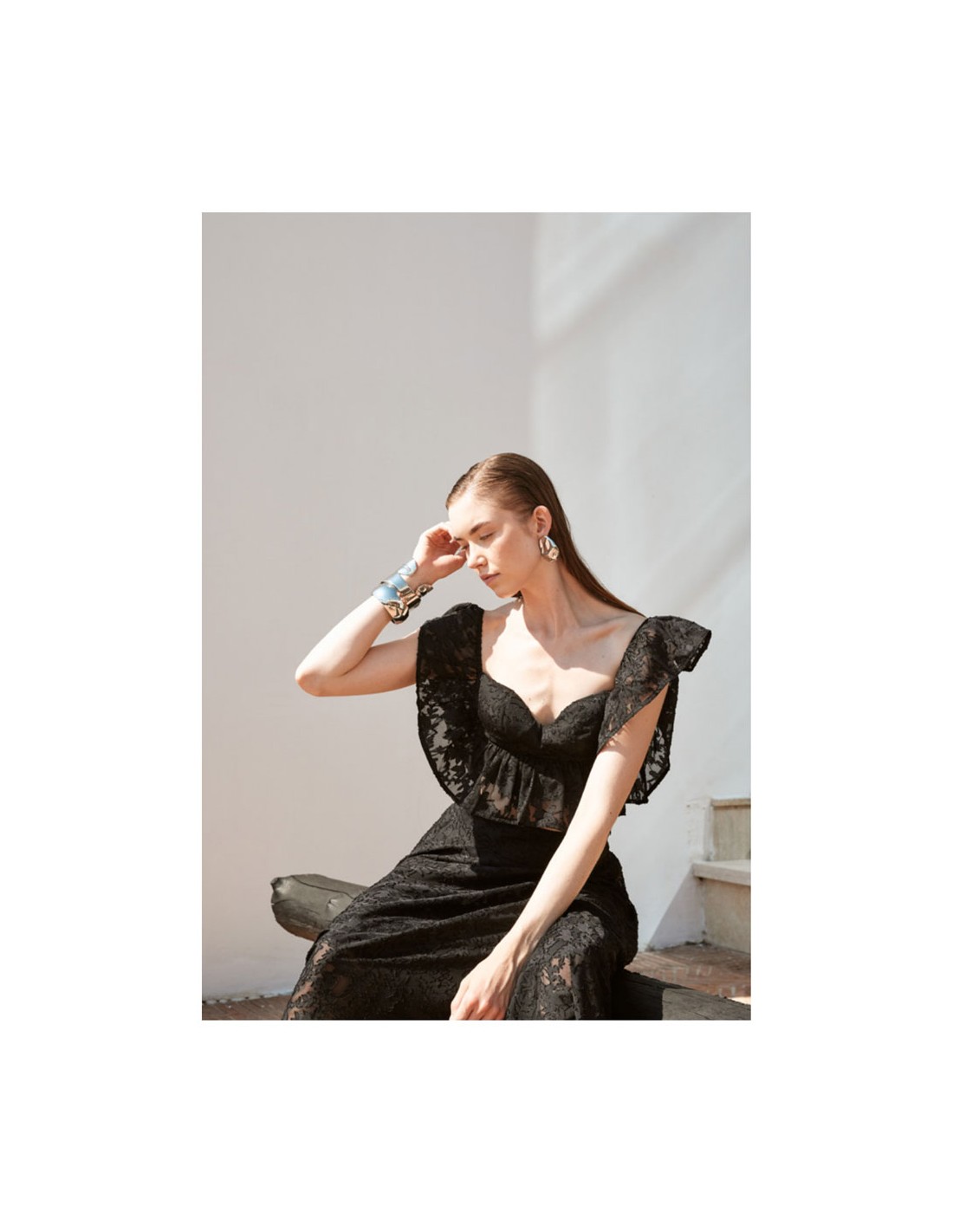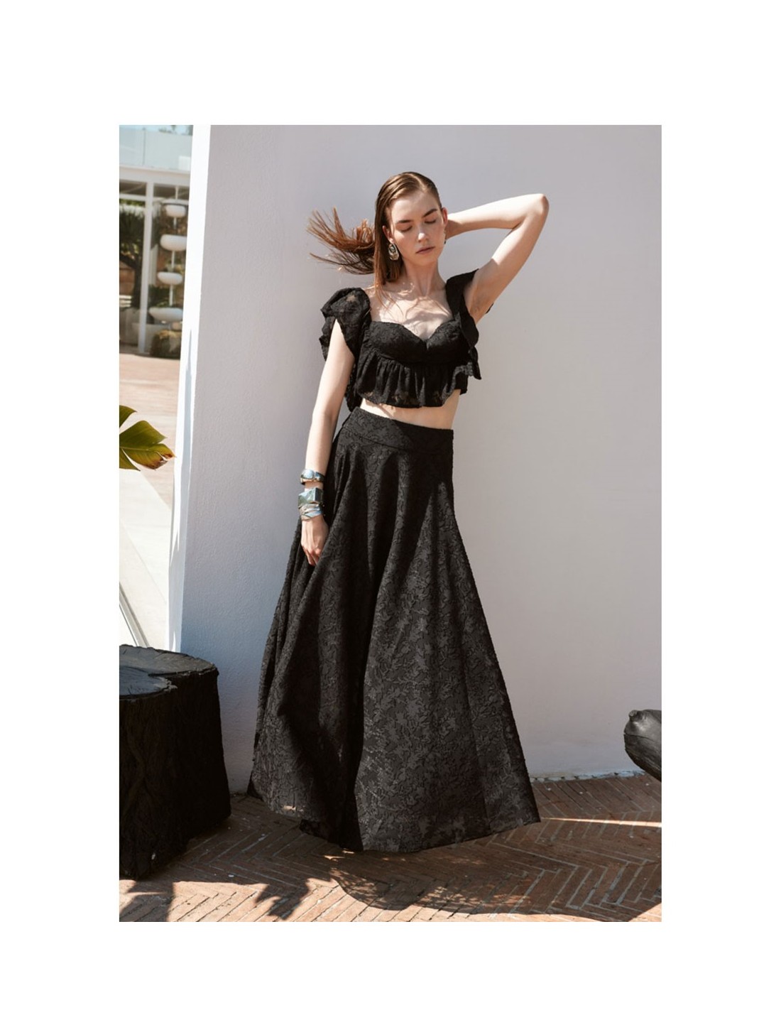 Completo Trashandluxury nero valorizza ogni outfit con un tocco moderno. Realizzato in poliestere, presenta pizzo top corto scollo a cuore maniche con voulants e chiusura con zip sul retro gonna lunga ampia in pizzo vita alta e chiusura con zip laterale. Ideale da indossare ogni giorno senza rinunciare allo stile. Aggiungilo ora al tuo guardaroba.