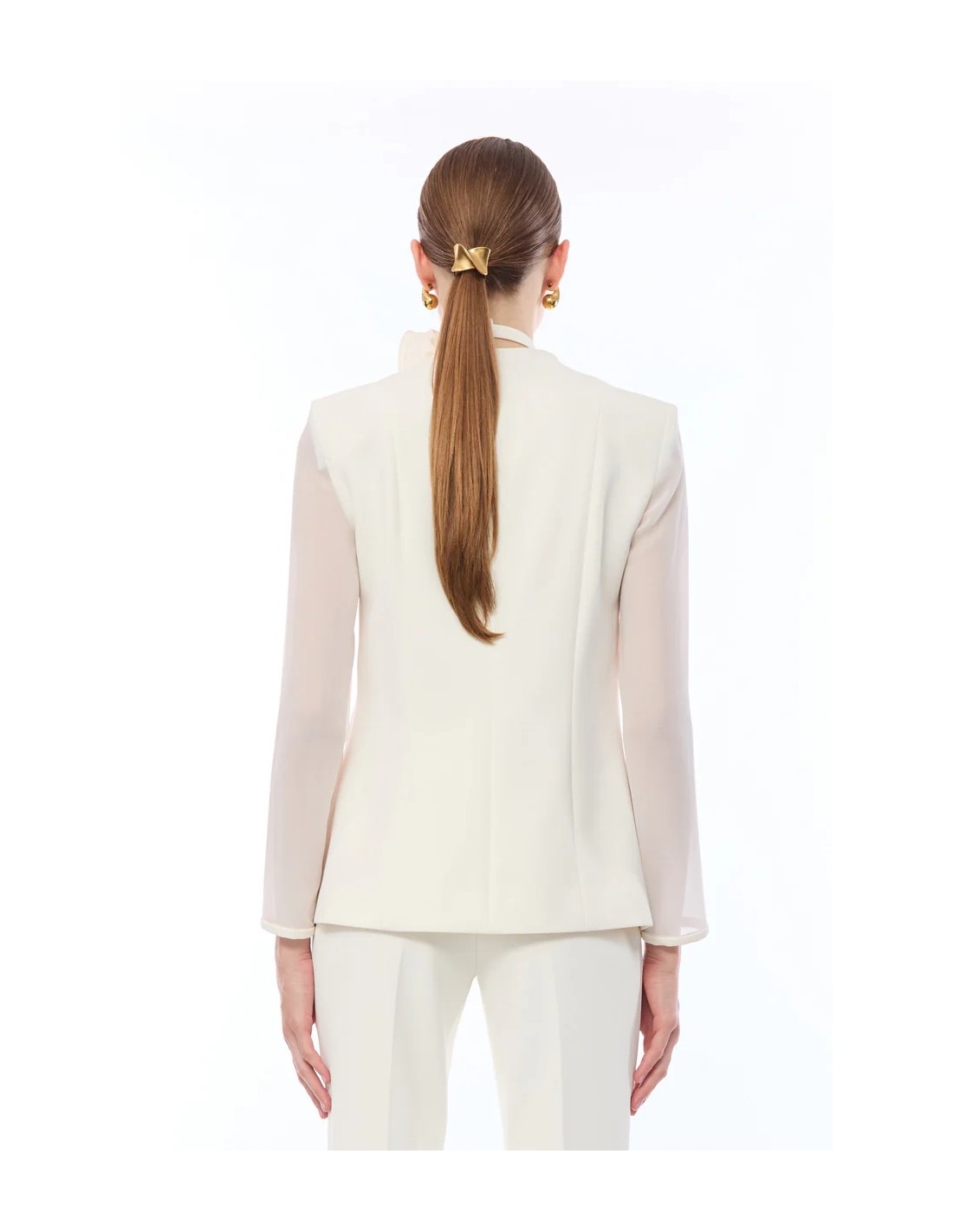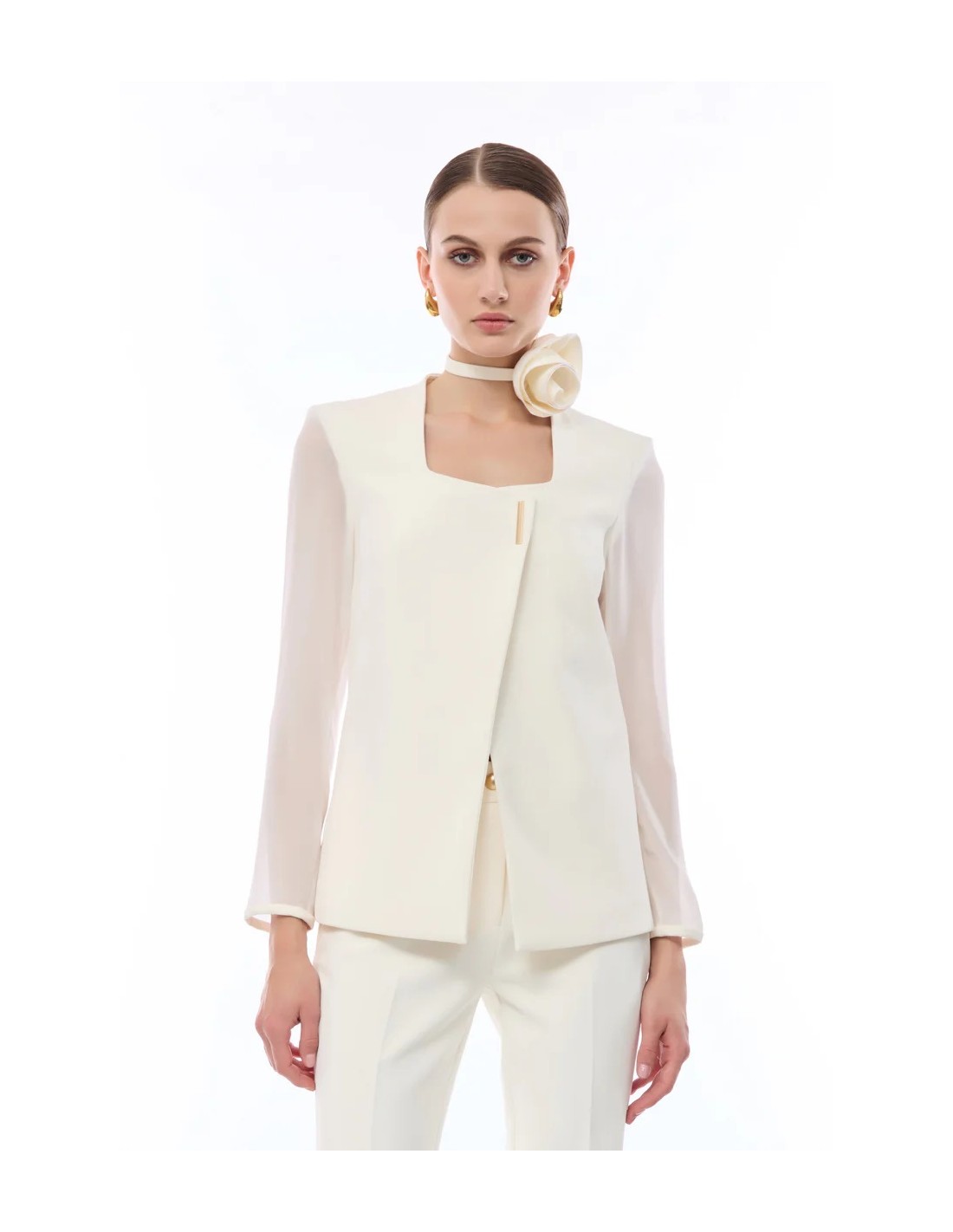 La Giacca Nenette avorio valorizza ogni outfit con un tocco moderno. Realizzato in cady, presenta maniche lunghe in georgette scollo quadrato collarino con fiore incluso rimovibile spacco e chiusura con bottone sul davanti. Ideale da indossare ogni giorno senza rinunciare allo stile. Perfetto per distinguersi con eleganza.