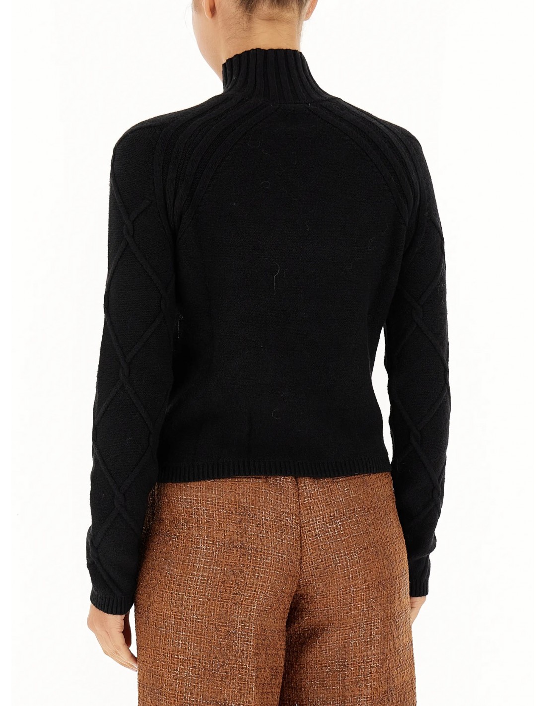 Immergiti nell'eleganza di Maglia donna KOCCA Maglia corta, nero, composizione poliestere, misto viscosa, maniche lunghe, collo alto e lavorazione a intrecci ideale per arricchire il tuo guardaroba con un tocco di classe.