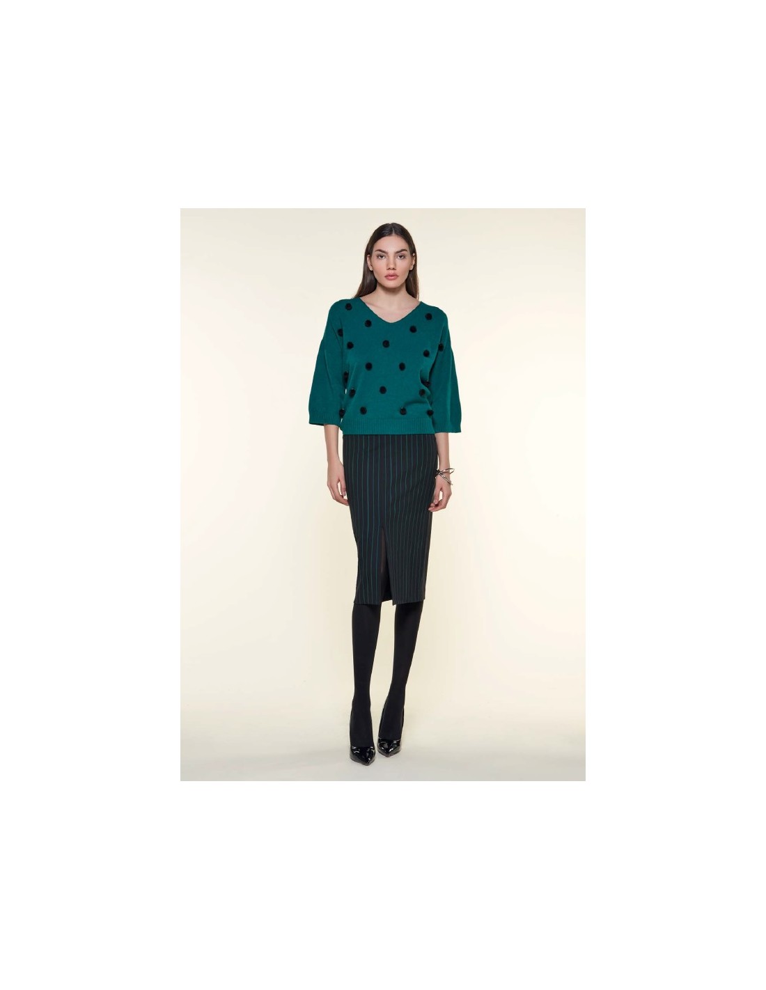 Verde Maglia Gai Mattiolo realizzato in scollo a v e pompon in applicazione, disponibile nel colore maniche tre quarti. Un capo immancabile per un guardaroba di tendenza.