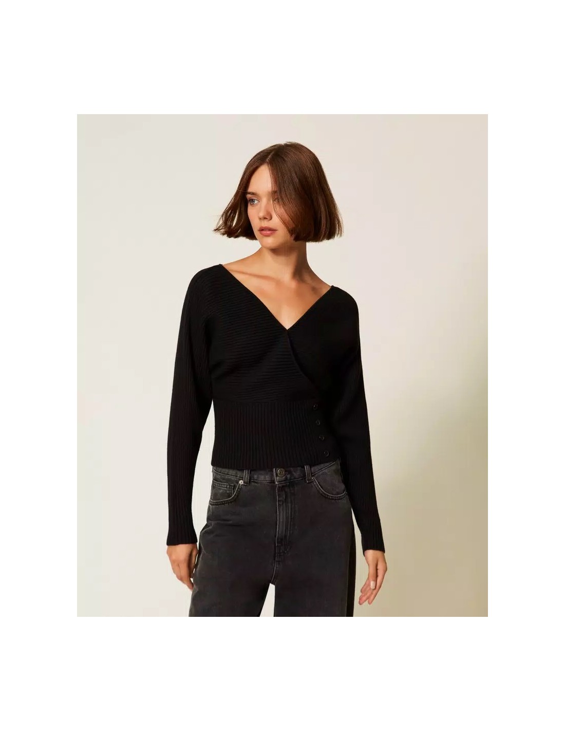 Il fascino senza tempo della maglia twinset in tonalità nero. Realizzato in composizione misto lana maniche lunghe, dona un tocco sofisticato e naturale. Caratteristiche: Scollo a v, Bottoni in applicazione sul davanti e chiusura con bottone sul retro. Impossibile resistergli: provalo con un tacco alto o un sandalo raffinato.