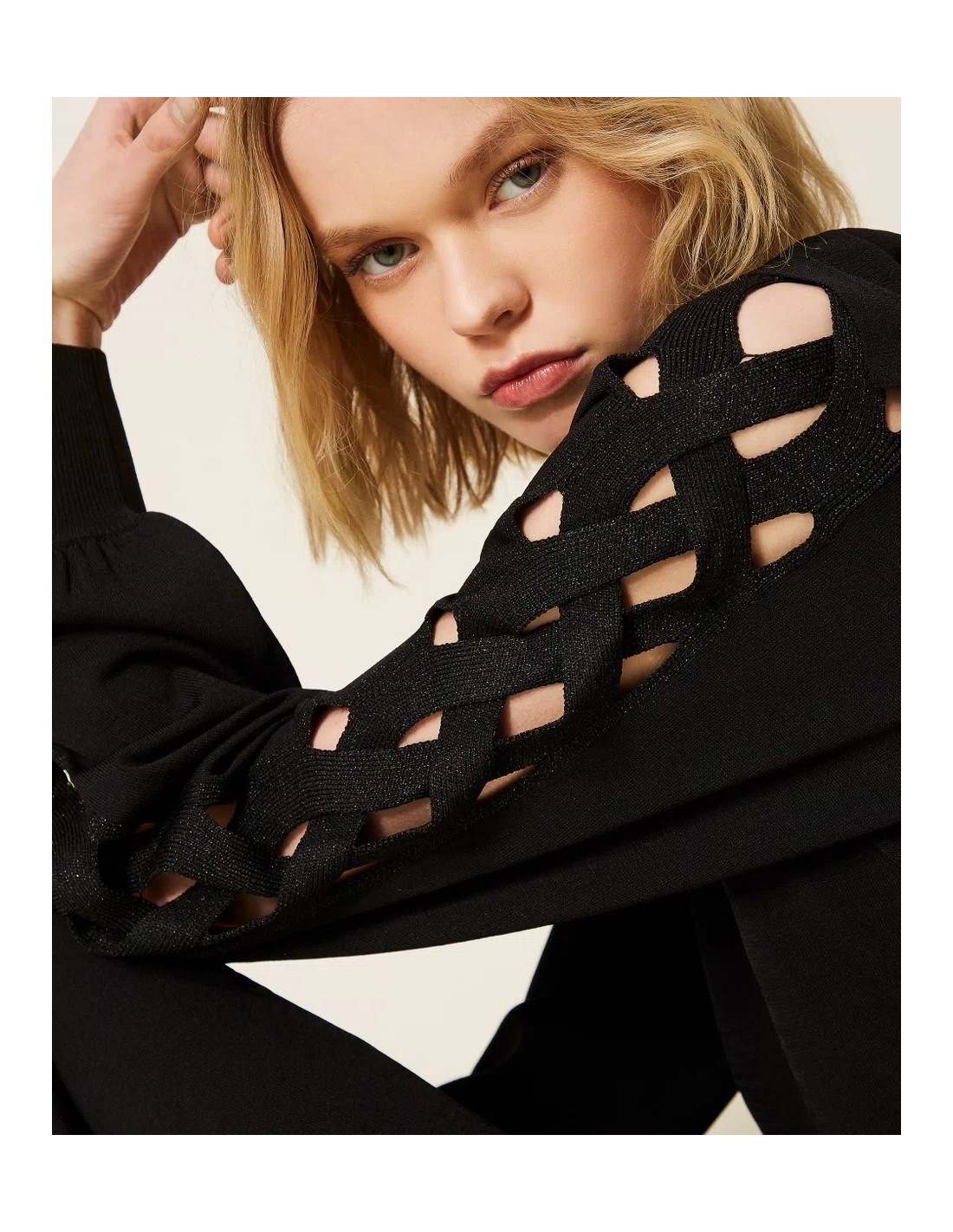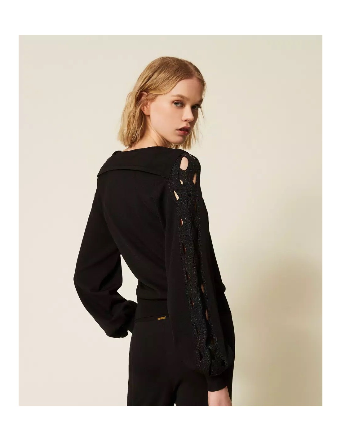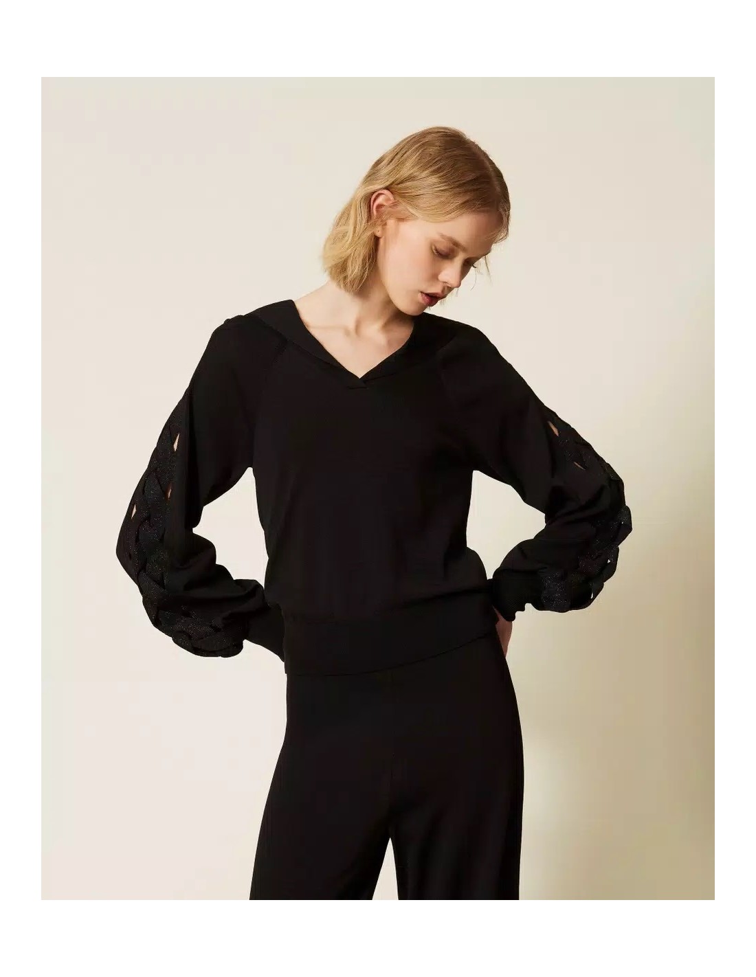 La Maglia Twinset nero unisce eleganza e comfort per un look contemporaneo. Realizzato in misto viscosa, presenta scollo a V e maniche lunghe a sbuffo con trecce e lurex in applicazione. Ideale da indossare ogni giorno senza rinunciare allo stile. Scoprilo subito e rinnova il tuo look.