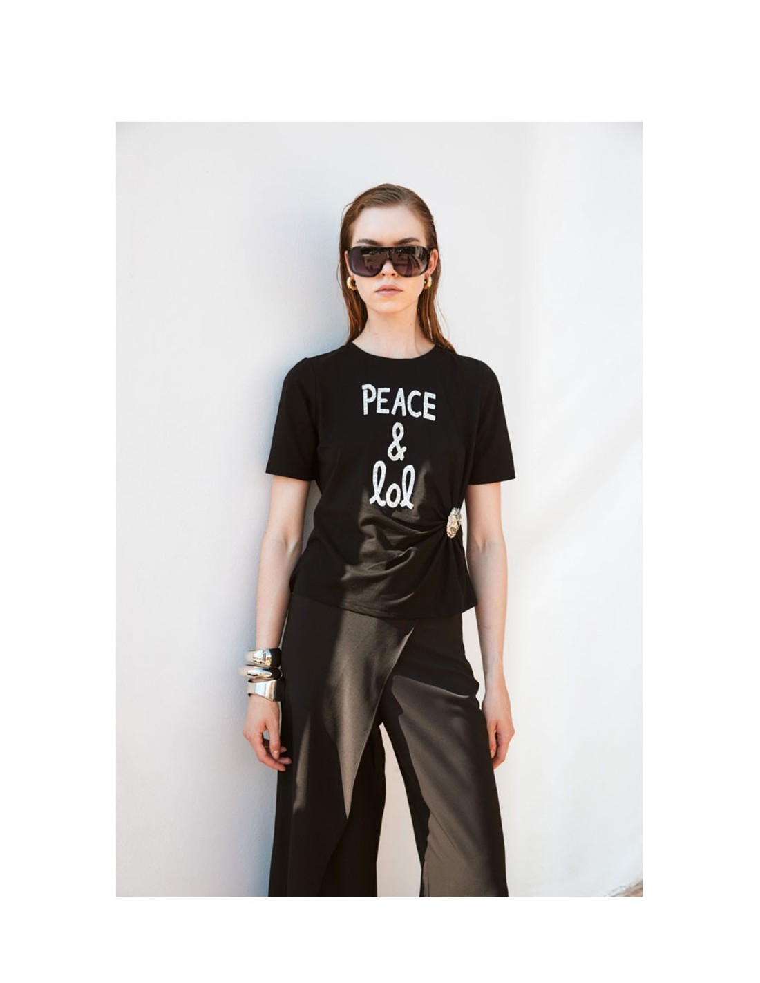 La T-shirt Trashandluxury nero valorizza ogni outfit con un tocco moderno. Realizzato in cotone, presenta girocollo maniche corte stampa spilla e strass in applicazione sul davanti. Perfetto per outfit casual chic o più raffinati. Perfetto per distinguersi con eleganza.