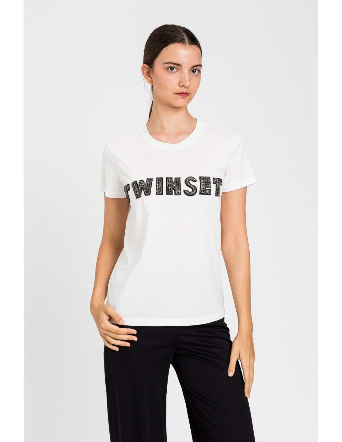 La T-shirt Twinset bianco è perfetto per completare il guardaroba con stile. Realizzato in cotone, presenta jersey viscosa girocollo maniche corte logo e strass in applicazione sul davanti. Ideale da indossare ogni giorno senza rinunciare allo stile. Un must-have per chi ama la moda.