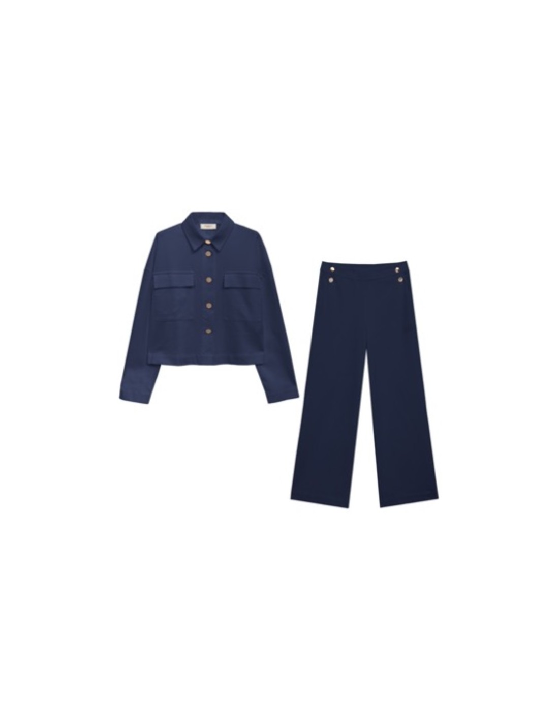 Tailleur Markup blu rappresenta il perfetto equilibrio tra eleganza e comfort. Realizzato in misto viscosa, presenta giacca maniche lunghe tasche sul davanti e chiusura con bottoni pantalone vita alta gamba larga tasche e chiusura con zip laterale. Perfetto per outfit casual chic o più sofisticati. Un must-have per chi ama la moda.
