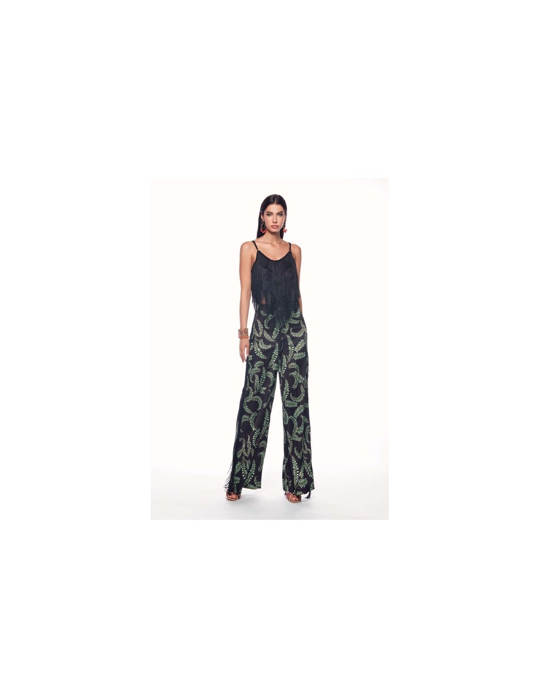 Il Pantalone Mattiolo nero-verde è la scelta ideale per un look contemporaneo. Realizzato in poliestere, presenta vita alta elastico sul retro e frange in applicazione sui lati. Ideale per completare il guardaroba con stile. Perfetto per distinguersi con eleganza.