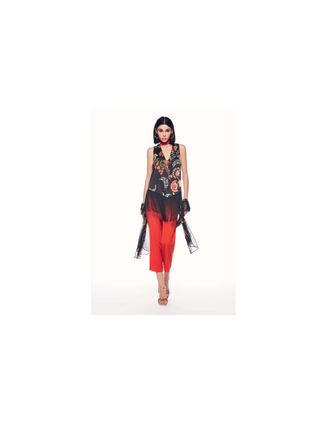 Il Top Mattiolo nero fantasia è la scelta ideale per un look contemporaneo. Realizzato in poliestere, presenta smanicato scollo a V e frange in applicazione sul fondo. Perfetto per outfit casual chic o più sofisticati. Aggiungilo subito al tuo guardaroba.