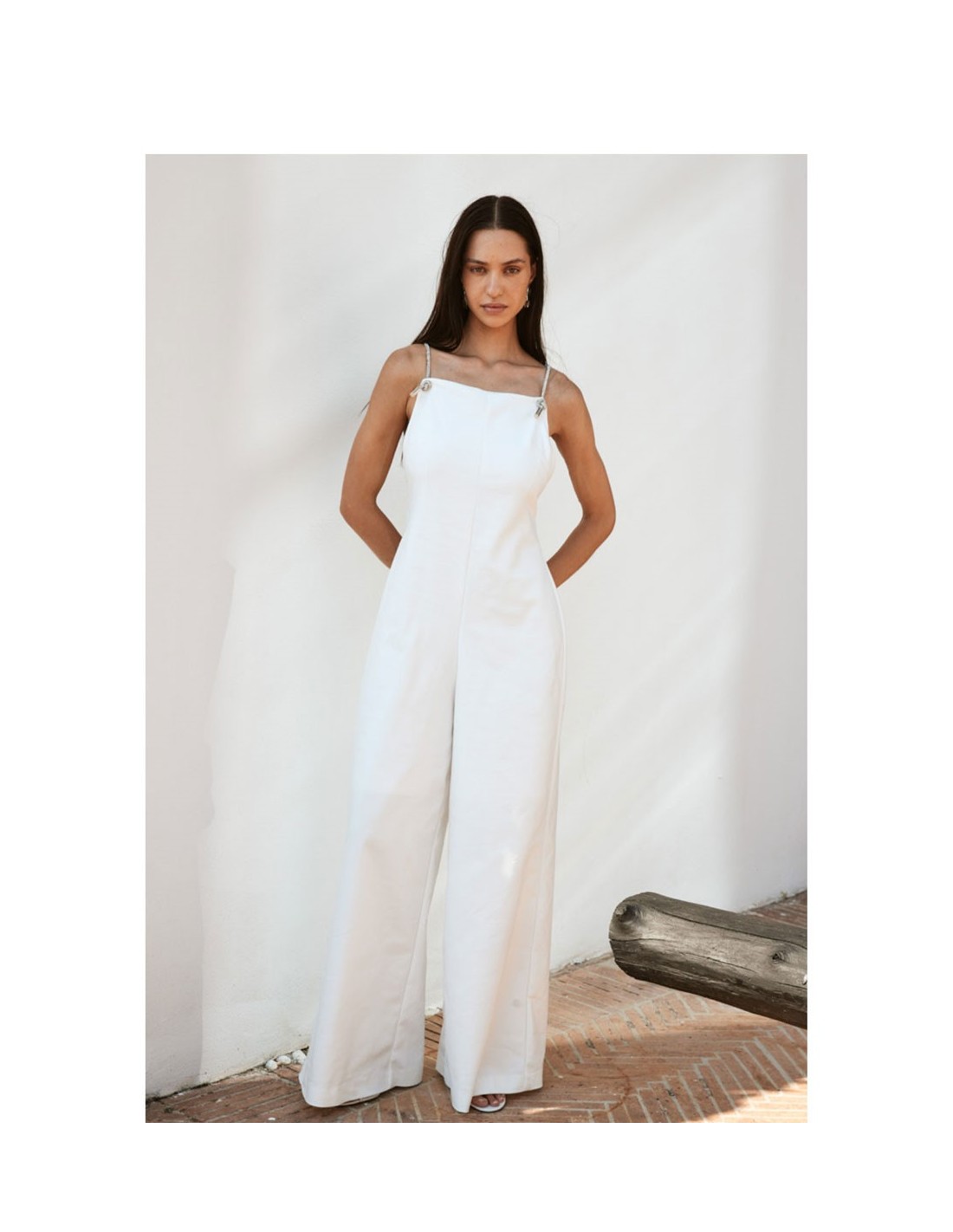 La Tuta Trashandluxury bianco unisce eleganza e comfort per un look contemporaneo. Realizzato in cotone, presenta smanicato collo all'americana gamba larga scollatura e chiusura con zip sul retro. Pensato per offrire comfort e qualità nei dettagli. Un must-have per chi ama la moda.